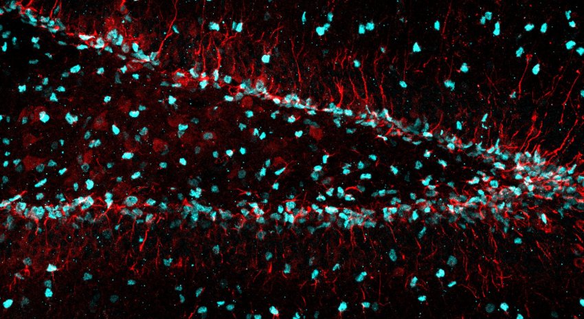 Immagine a immunofluorescenza del giro dentato, all'interno dell'ippocampo, uno dei 2 posti dove risiedono le cellule staminali neuronali nel cervello di topo. Nell'immagine molte cellule staminali neurali nel cervello colorate dalla vimentina in rosso e dalla Sox2, un marcatore delle cellule che si auto-rinnovano, in turchese. (Fonte: Christopher Morrow)