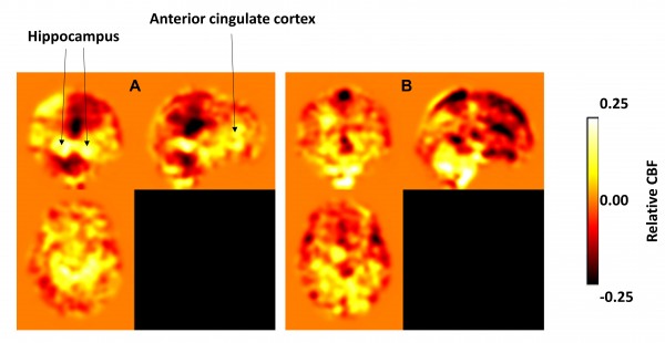Flusso di sangue al cervello di anziani a rischio di Alzheimer dopo un anno di (A) esercizio fisico aerobico e (B) semplice stretching. In bianco e giallo l'aumento del flusso nell'ippocampo, la corteccia cingolata anteriore, e in altre regioni frontali.