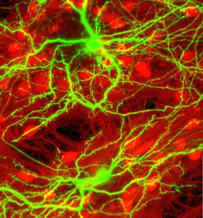 Coltura di neuroni con 80% inibitori (rosso) e 20% eccitatori (verdi). La quota di neuroni inibitori è circa 4 volte più alta del normale nel cervello, e tuttavia la rete si è rivelata sorprendentemente stabile. Fonte: ©Menahem Segal